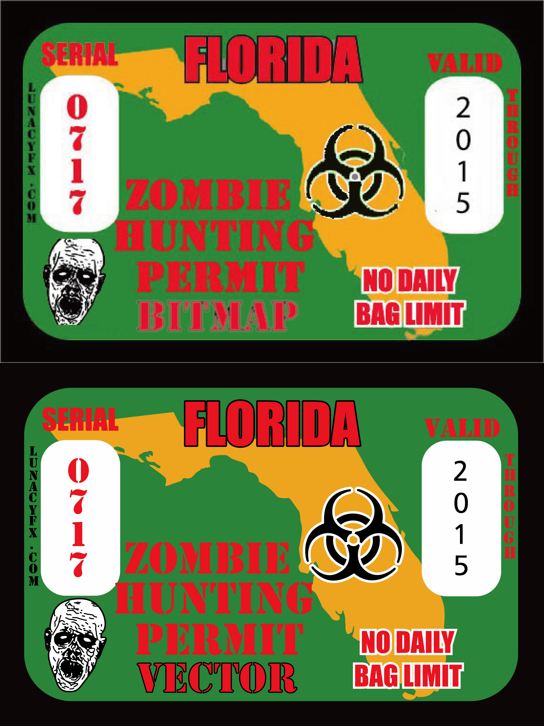 Here is another awesome zombie themed vector sample. Notice that the vectored permit is much clearer and authentic looking than the low resolution original jpg. We also have the ability to make simple adjustments through our “Copy Vector” service, such as changing letting or moving parts around, for no additional cost. So you can not only have a clean authentic looking image, but one customized to your needs/liking.